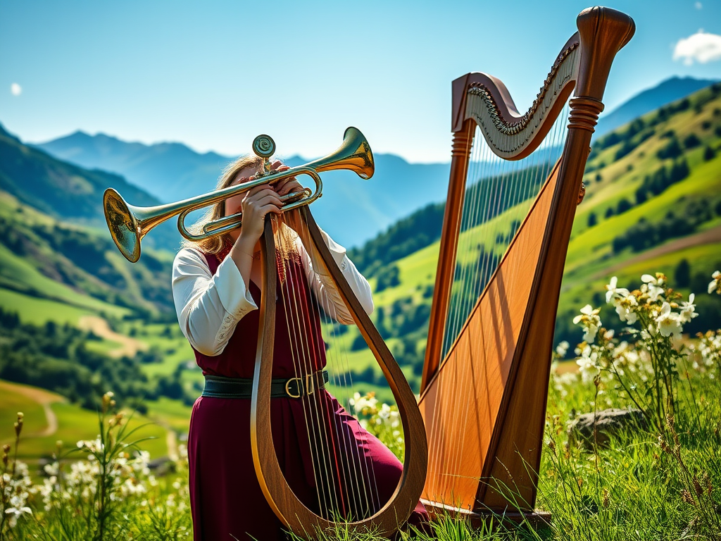 Our ai generated image depicting 3 musicians sounding the Biblical instruments