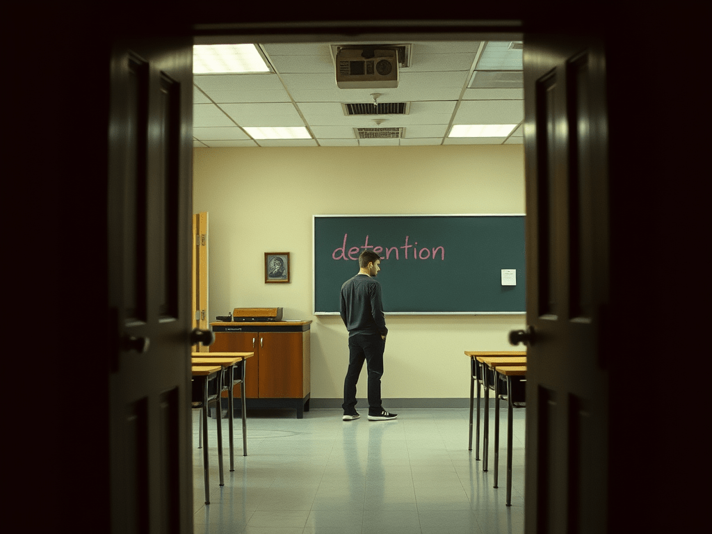 At schools detention is a punishment where a student is required to stay at school for a specified period after regular school hours. It may include other forms of punitive disciplinary measures, aiming to sour up the experience of violating rules or other bad conduct.